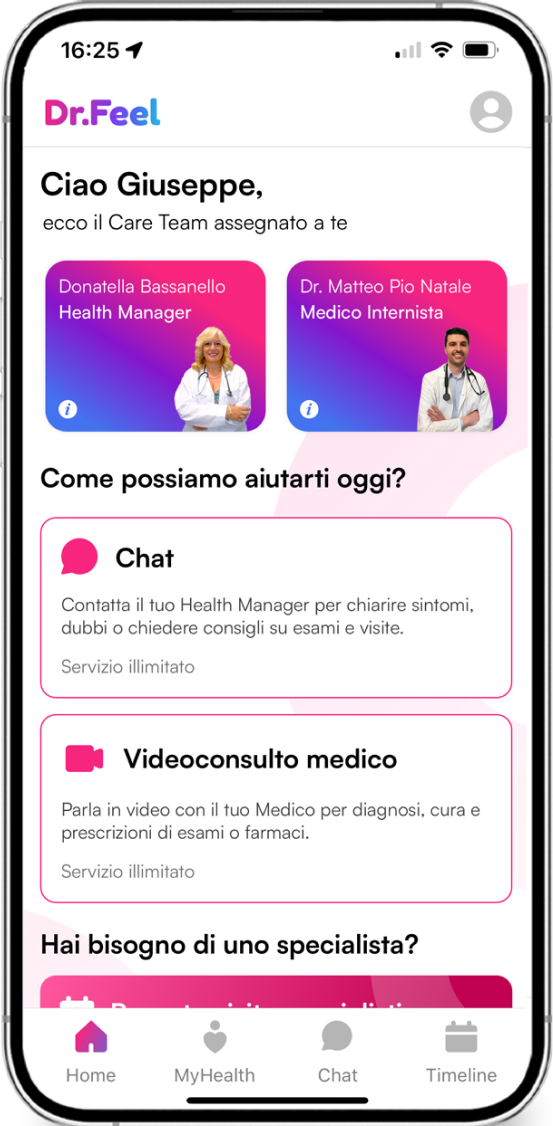 Il Team Medico personale ti viene assegnato in base al tuo punteggio di salute e benessere MyHealth score®: il tuo Health Manager, Medico Personale o Pediatra vengono scelti per te in base alle tue esigenze e storia clinica. Ad esempio, se hai una problematica di natura ginecologica, sarai seguita da un Health Manager con esperienza in Ostetricia, oppure se hai un problema cronico-respiratorio, verrà scelto un Medico Personale con specializzazione in Pneumologia.